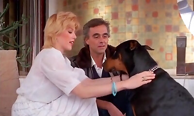 Busty platinum-blonde woman in red, satin half-top, Sharon Pink got fucked from the back, while standing
