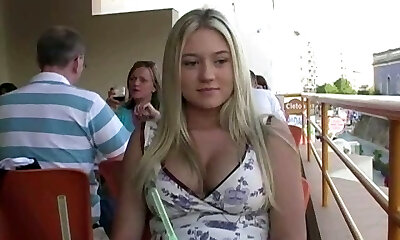 Fantastic blonde in black dress hooks up with a guy and goes with him