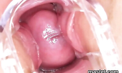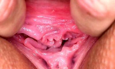 Lovely teenage is gaping pink puss in close up and having orgasm