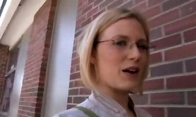 Nerdy brunette in glasses Michele James is testing yam-sized ebony dick sticking out of the wall