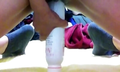 Some wild insertion of bottle into shaved wet gash closeup